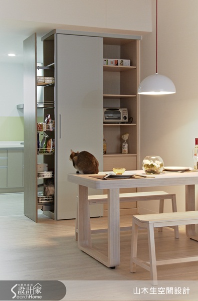 廚房與餐廳之間,將做到天花板高度的收納櫃體,規劃成多面開法的設計,同時滿足廚房做菜及餐廳用餐時的收取機能,並且在視覺上也更為俐落地,將零碎收納機能化整惟一地整合起來,簡化空間量體線條。